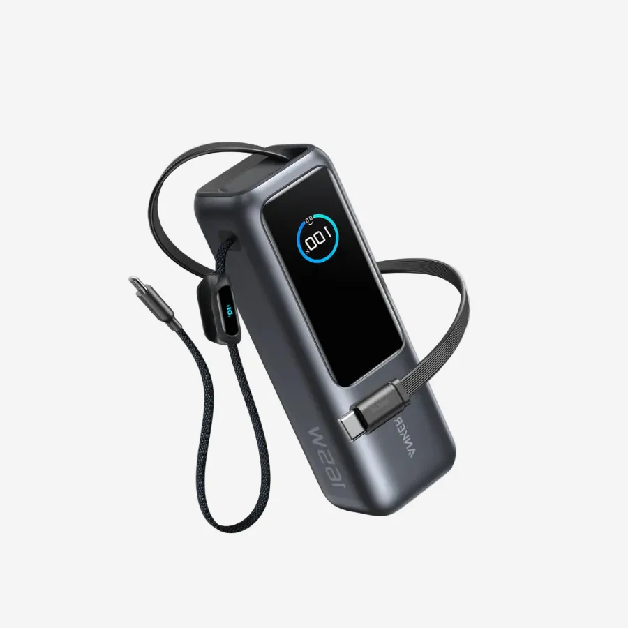 A 25,000mAh power bank with 165W fast charging, built-in USB-C cables, and a retractable cable for multiple devices. Features four ports and a smart display for optimal convenience.